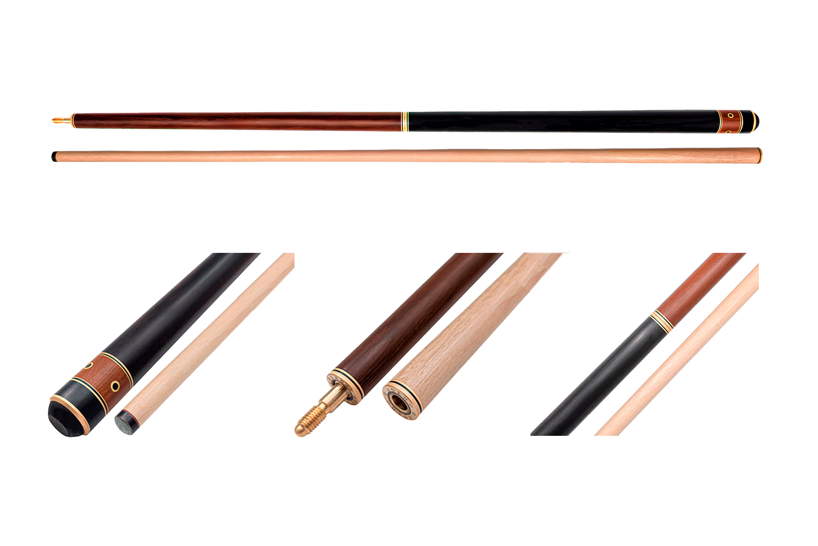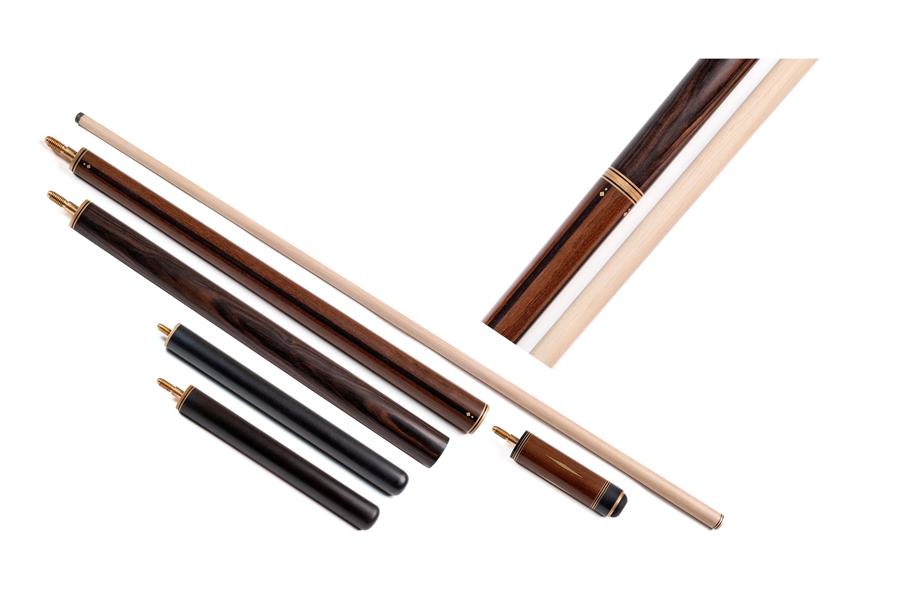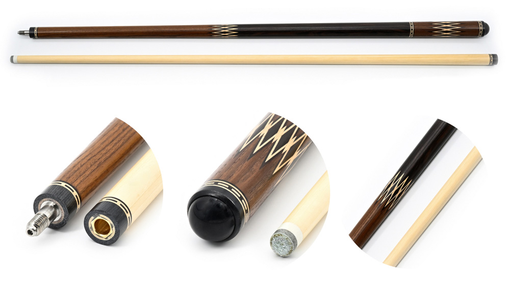 Большое влияние на выбор модели оказывают элементы оформления: обмотка, резьба на рукаве, инкрустация камнем, цвет и форма запилов. Древесина для изготовления выбирается твердая, можно купить разборный кий для русского бильярда из граба, палисандра, с запилами из груши, карельской березы и др.